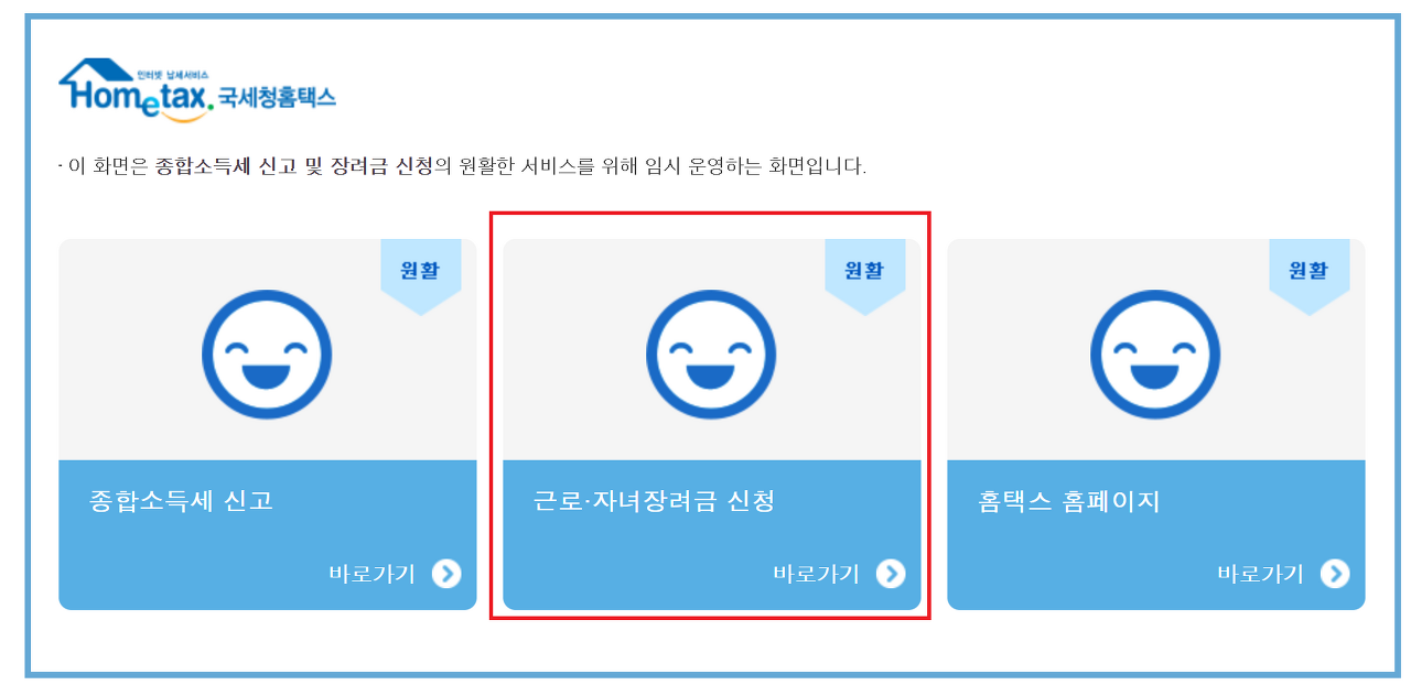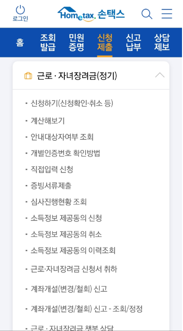 2) 다음 그림의 빨간색으로 표시된 부분의 근로·자녀장려금을 클릭합니다.
