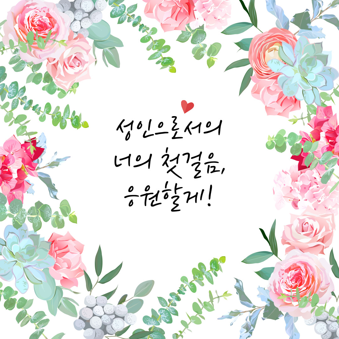 "드디어 성년이 되었네, 친구! 이제부터 너의 선택과 결정이 더욱 중요해질 거야. 항상 현명하고 용감하게 너의 길을 걸어가길 바라. 너의 모든 도전과 성공에 함께 할 수 있어서 행복하다."