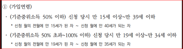 (가입연령) 신청 당시 만 19세~만 34세 청년 단, 수급자·차상위자·기준 중위소득 50% 이하자는 만 15세~만 39세까지 허용
